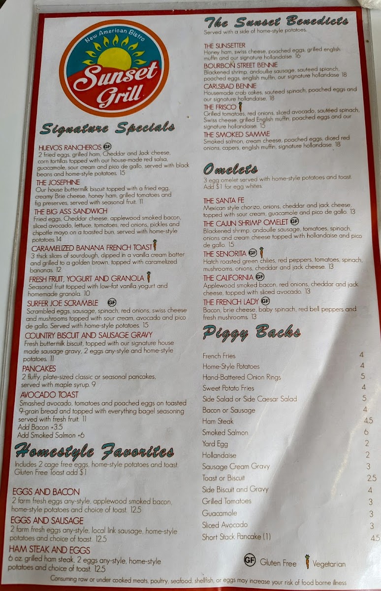 Sunset Grill Menu